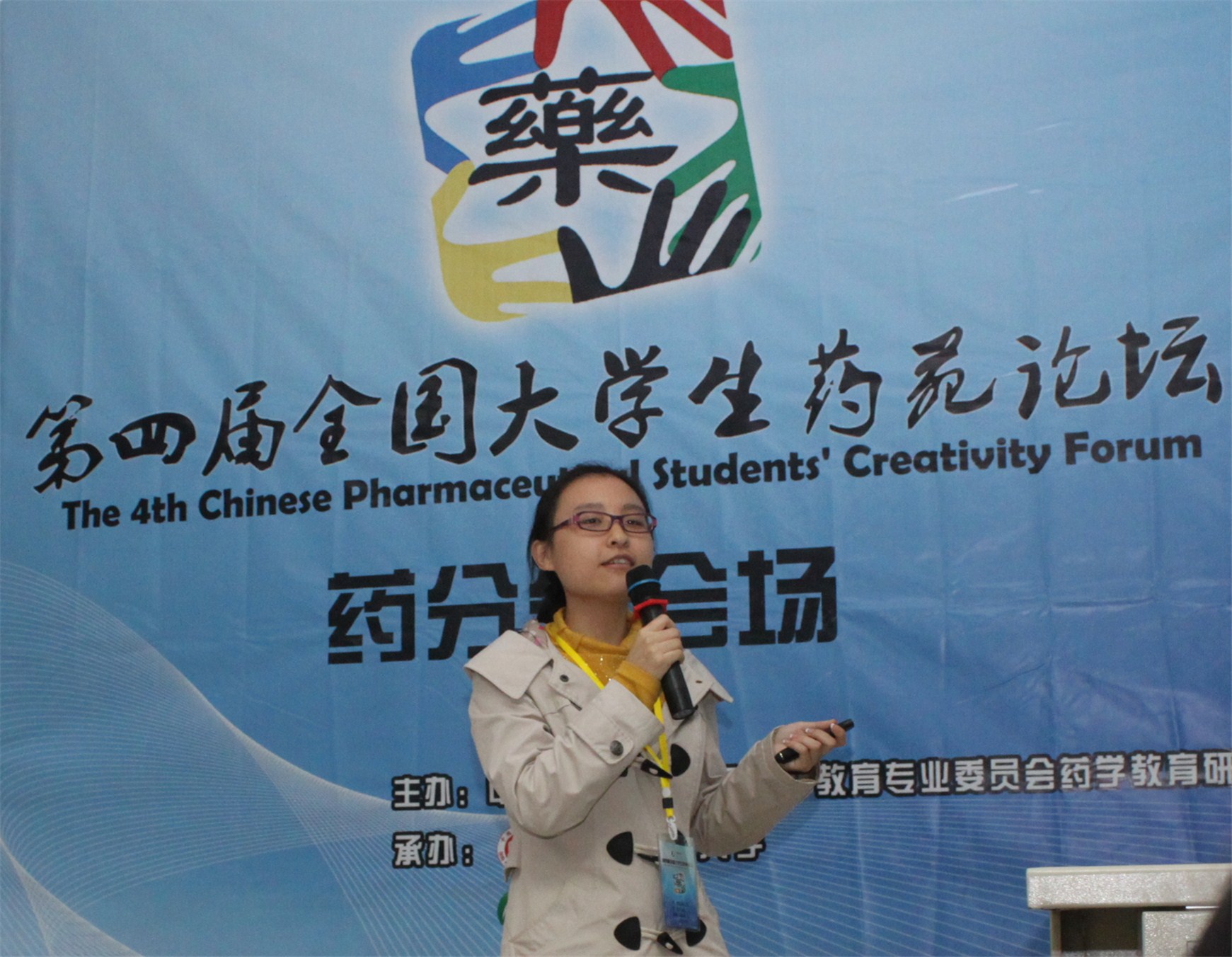 学生代表叶亚婧汇报了“超声酶法提取红藤中有效成分的工艺及提取物抗氧化性研究”项目的研究成果,周雅迪汇报了“基于Multitarget-QSAR和化学基因组学的配体-蛋白相互作用预测方法研究”项目的研究进展,均荣获“第四届全国大学生药苑论坛创新成果三等奖”。