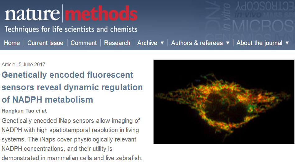 杨弋教授、赵玉政研究员课题组与中国科学技术大学刘海燕教授课题组合作的研究成果:“Genetically encoded fluorescentsensors reveal dynamic regulation of NADPH metabolism”。