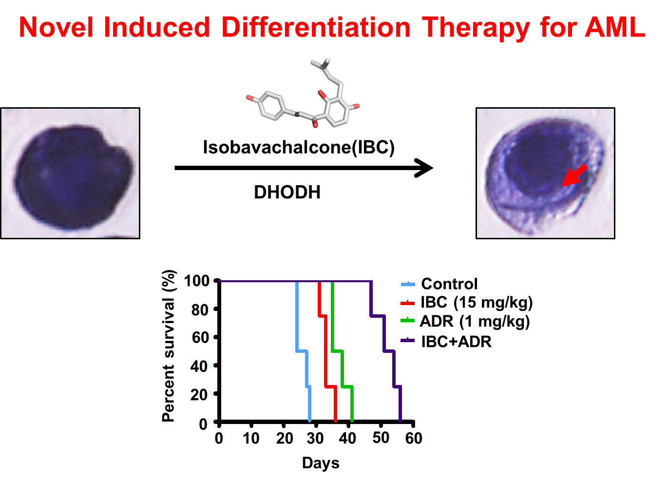 精确靶向AML细胞早期分化障碍是AML治疗药物开发的一个重要策略。近年来,黄瑾课题组致力于探索新型AML分化调控蛋白,并开展靶向创新药物开发工作。在本研究中,通过大规模的生物信息学分析,发现二氢乳清酸脱氢酶(DHODH)与AML病人的疾病进程和不良预后密切相关。基因编辑工具CRISPR/Cas9介导的DHODH基因敲除可显著抑制AML细胞生长,诱导AML细胞分化并发生凋亡。进一步药物筛选发现天然小分子补骨脂乙素(IBC)能有效抑制DHODH活性,通过结合蛋白热稳定性测定,核磁共振和等温滴定量热法等多种实验方法,证实IBC可直接结合于DHODH,并通过抑制DHODH诱导AML细胞分化。口服IBC可有效抑制AML的肿瘤生长,并能在体内外有效增强AML对化疗药物阿霉素的敏感性。该研究成果不但证实了DHODH是AML分化的重要调控蛋白,从而为AML分化治疗的提供了全新靶标,同时也为AML治疗药物开发提供了新的候选药物分子。