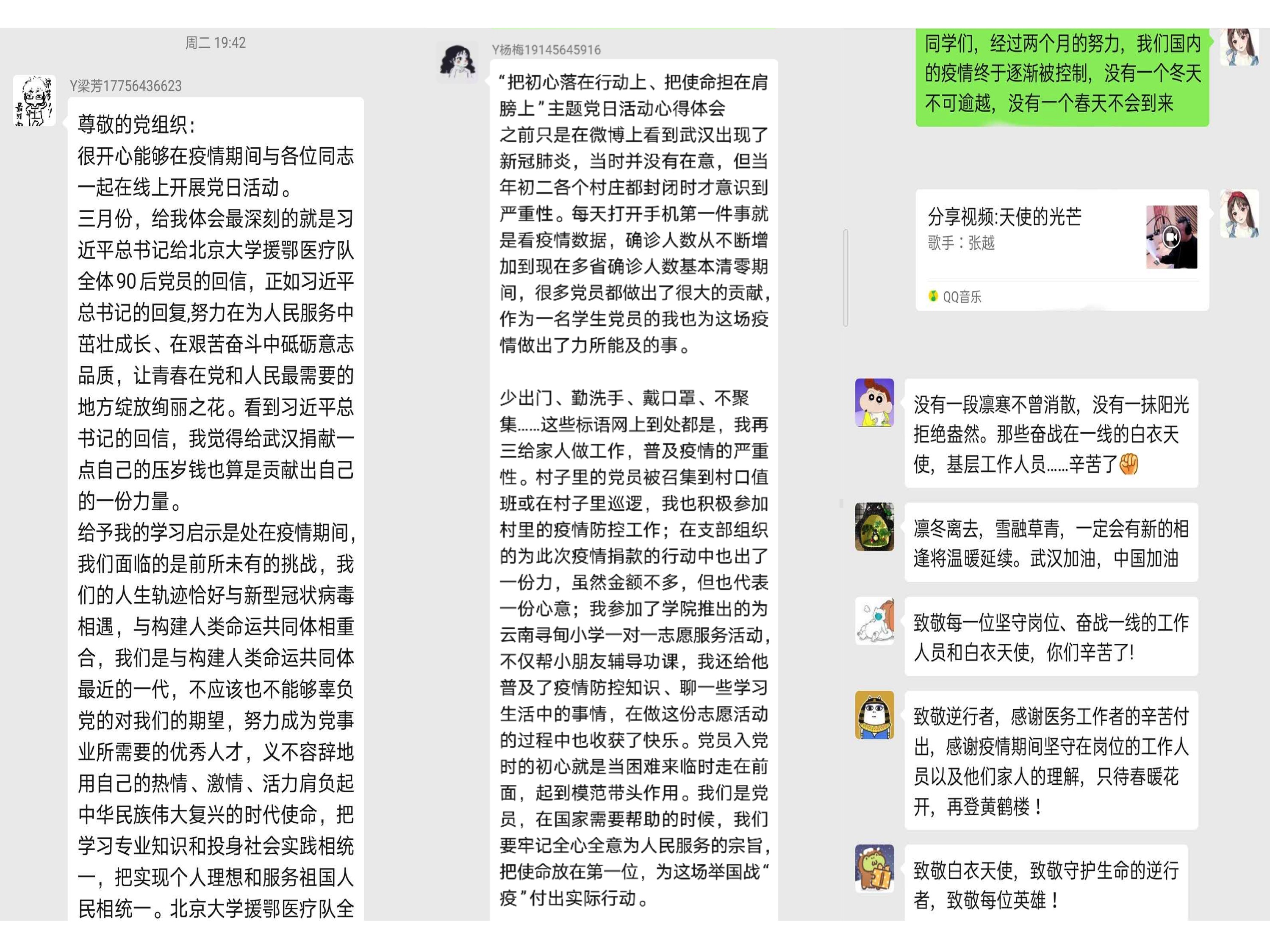 疫情期间,我院学生党员积极响应组织号召在村委、居委开展志愿服务工作,尽己所能捐款捐物。在本次党日活动中,这些在抗疫期间努力作出自己贡献的同学也都在支部内分享自己的感思,激励全体研究生党员时刻牢记为民初心,尽己所能服务社会、服务人民。也有支部以逆行医护人员、雷神山建设者、社区基层工作人员的感人事迹及习近平总书记给北大援鄂医疗队全体“90后”党员的重要回信为学习素材开展讨论。