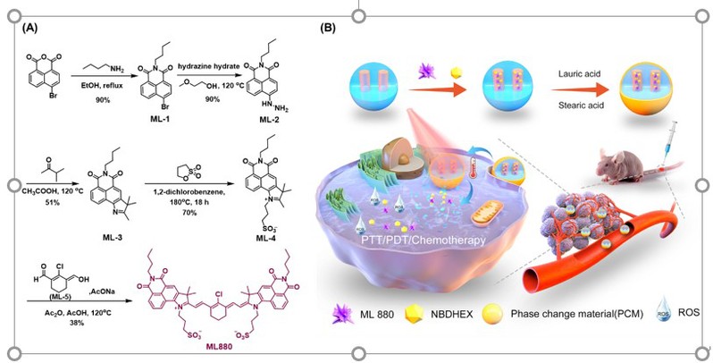 光疗法具有时空精度高、操作简单、特异性高等优点,被认为是各种肿瘤消融的新兴治疗方法。有机光治疗试剂如卟啉、酞菁、氟硼吡咯、菁染料及其衍生物等,因其具有易修饰、光物理和光化学性质可调、固有的生物降解性和良好的生物相容性等优点而受到广泛青睐。基于近红外光激发的光治疗试剂由于具有更深的组织穿透深度,可以实现更优异的光治疗效果。基于此,作者利用染料整合策略,通过模仿菁染料聚甲川链体系,设计并合成了一种新型近红外染料ML 880。以商业化的新吲哚菁绿IR820作为参照,通过密度泛函理论计算发现:ML 880中萘酰亚胺片段的引入可以增强电子离域,使得ML880波长发生红移。同时ML 880在体外和细胞实验中表现出良好的光动力和光热效果。由于纳米装载策略可以提高染料的稳定性,肿瘤靶向性以及提供联合治疗场所,作者进一步针对肿瘤微环境中高水平活性氧,构建了一种光热/活性氧双响应的可降解药物递送系统NBD&ML@RMON,用于880 nm激光和活性氧辅助的肝癌联合治疗。利用相变材料月桂酸和硬脂酸作为热响应开关,将近红外染料ML 880和谷胱甘肽-S-转移酶抑制剂(NBDHEX)共同装载到可降解介孔氧化硅纳米粒子RMON中。在880 nm激光照射下,ML 880的光热效应可以融化相变材料,使装载的ML 880和NBDHEX释放,不仅可以实现光热/光动力/化疗的联合治疗,而且可以实现治疗试剂在肿瘤区域的按需释放。该工作以题为“Engineering naphthalimide-cyanine integrated near-infrared dye into ROS-responsive nanohybrids for tumor PDT/PTT/chemotherapy”的研究性文章发表于《Bioactive Materials》。