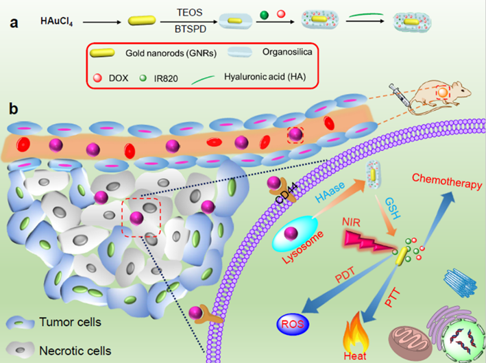 近年来,金纳米棒(GNRs)在CT/光声/光热成像方面受到研究者较多的关注,通过调节其长径比,可以制备出不同纵向等离子体共振(LPSR) 吸收波长的GNRs。GNRs在与其吸收波长匹配的激光照射下具有明显的光热效应,在生物医学领域表现出良好的应用前景。由于GNRs比表面积较小,不利于药物装载及化学修饰,而介孔氧化硅具有多孔结构,可作为负载药物的载体。基于此,作者针对肿瘤细胞内高浓度谷胱甘肽(GSH),设计了可降解氧化硅包覆的金纳米棒作为药物载体,同时装载药物化疗DOX和近红外染料IR820,并在纳米颗粒表面修饰透明质酸(HA),靶向CD44受体过表达的肿瘤细胞。纳米药物 IR&DOX@NC经尾静脉注射进入荷瘤鼠,通过主动靶向和被动靶向在肿瘤区域积累,并经受体介导的“内吞”方式进入细胞。在细胞内透明质酸酶和GSH作用下,HA和氧化硅壳层降解,实现药物释放。在808 nm激光照射下,IR820 产生单线态氧杀灭肿瘤细胞;GNRs 产生光热效应,升高肿瘤部位温度致使肿瘤细胞死亡。这种透明质酸酶/GSH双响应的纳米药物递送系统IR&DOX@NC在近红外光照下实现了肿瘤的化疗/光动力/光热联合治疗。相关工作以题为“Dual-responsive nanohybrid based on degradable silica-coated gold nanorods for triple-combination therapy for breast cancer”发表于《Acta Biomaterialia》。