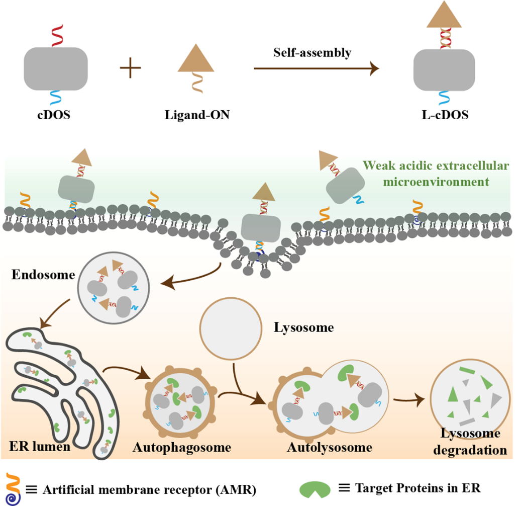 研究团队利用具有ER靶向能力的DNA纳米器件(cDOS),设计并组装了一种可特定降解MBO内蛋白质的靶向工具。作者首先构建了一种具有肿瘤微酸性环境响应性的核酸-多肽偶联物(AMR)作为靶向肿瘤细胞的人工受体,通过碱基互补配对使肿瘤细胞可特异性摄取cDOS。随后cDOS通过小窝蛋白介导的内吞作用被细胞摄取,继而被转运至ER,最后通过自噬途径被转运至溶酶体降解。利用这一发现,在cDOS上通过自组装引入ER内蛋白结合配体(Ligand-ON)以构建靶向蛋白降解体(L-cDOS),当L-cDOS被运送至ER后,其与ER内靶向蛋白质结合,最后依赖自噬-溶酶体路径将结合的蛋白降解。