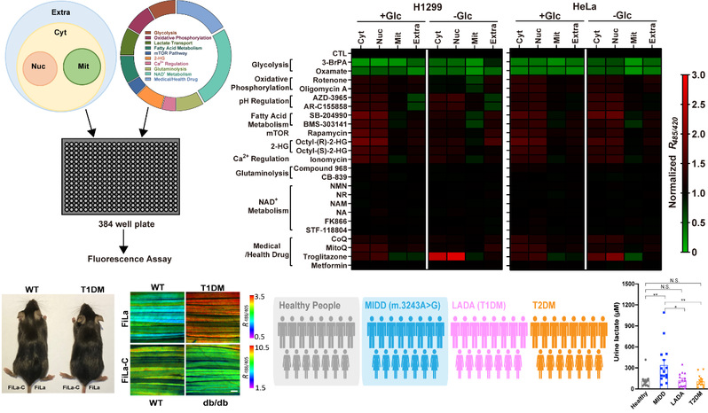 利用FiLa探针,作者首先绘制了亚细胞乳酸代谢图谱。现有的教科书告诉我们乳酸作为糖酵解产物,定位于细胞浆。上世纪90年代末研究者发现线粒体中存在乳酸脱氢酶,由此线粒体内是否存在乳酸这一问题引发了一系列研究和激烈讨论。利用FiLa探针,研究团队率先报道细胞核内乳酸水平与细胞浆水平相近,而线粒体内乳酸水平远高于细胞浆和细胞核。这一发现解决了该领域争议了几十年的重要科学问题,同时首次使人们观察到,人体细胞内乳酸具有更丰富的代谢命运,从而打开了乳酸代谢研究的新窗口。接下来,研究团队基于FiLa探针建立了活细胞水平药物高通量筛选方法,发现乳酸是感知各种代谢活动的关键枢纽。研究团队进一步利用FiLa探针对I型糖尿病和II型糖尿病小鼠开展了活体动物成像研究,并建立了基于FiLa探针的高通量临床样本即时检测技术,分别测定了成人隐匿性自身免疫性糖尿病(I型糖尿病的一类分型)、II型糖尿病、母系遗传性糖尿病伴耳聋(MIDD)患者以及健康人的体液乳酸水平,发现MIDD糖尿病人尿液中乳酸水平升高。由于MIDD患者的发病年龄和临床表现缺乏显著的区分度,经常被误诊为I型或II型糖尿病,发现尿液乳酸显著升高可能作为该疾病的潜在筛查标志物,为临床诊断提供了重要依据。