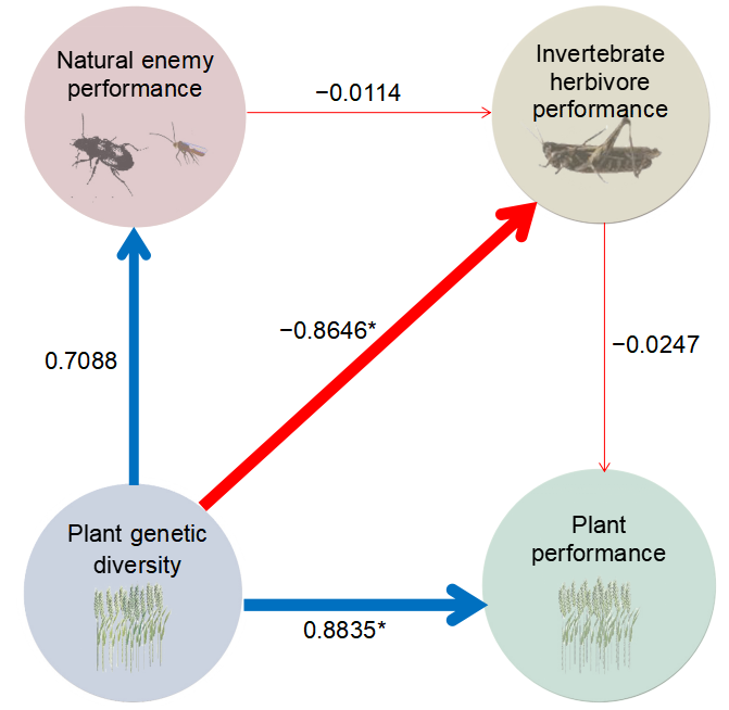 进一步利用结构方程模型量化各营养级功能群之间关系,结果显示:1)在无天敌的作用下,植物基因多样性能够抵抗植物有害生物(病虫草害),使其危害降低,而植物有害生物下降促进了植物的生长发育与繁殖并增强了品质;2)在植物、植食性昆虫、天敌共存的三营养级功能群中,多样化的植物基因有利于天敌,增强了天敌对害虫的控制效果,植物多样性通过提升天敌对害虫的控制能力来增强植物性状。
