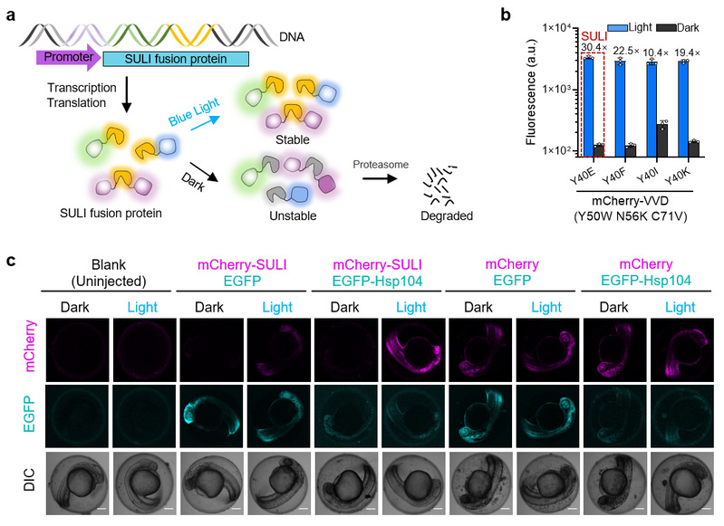 在本研究中,研究团队基于光敏蛋白VVD发展了光诱导稳定的蛋白质降解标签SULIstabilization upon light induction)。在黑暗条件下,SULI标签会被细胞的降解系统识别并降解;在蓝光照射下,SULI标签则非常稳定。实验结果表明,SULI可被用于调控多种报告蛋白的稳定性。更重要的是,SULI可插入在目的蛋白的N端、C端甚至是内部来调控它们的稳定性。进一步研究结果表明,SULI对目的蛋白的降解是光强依赖的,并且可以震荡式调控目的蛋白在细胞中的丰度。本研究还研究了SULI介导蛋白质降解的分子机制。结果表明,SULI是通过非赖氨酸泛素化依赖的蛋白酶体途径降解的,并且还伴随有聚集与去聚集过程。研究团队利用显微成像实验证明SULI在其降解过程中会发生聚集,并在Hsp104蛋白的辅助下完成去聚集并进入蛋白酶体完成降解过程。本研究随后利用SULI调控酵母细胞内源蛋白SicI的稳定性,实现酵母细胞周期的精确控制。此外,SULI还可用于调控斑马鱼中蛋白质的稳定性,通过对Pitx2蛋白稳定性的调控,本研究实现斑马鱼发育过程的精确控制。综上,SULI为研究不同细胞过程中的蛋白质代谢和功能提供了一个强大而方便的工具。