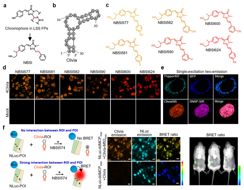 研究团队发展的Clivia荧光RNA适配体仅由30个核苷酸构成,以纳摩尔级的高亲和力结合不发光的NBSI染料分子,进而激活高亮度荧光。研究团队通过对NBSI染料分子进行修饰改造,成功获得了光谱涵盖黄色到红色系列高亮度荧光RNA。这些荧光RNA的斯托克斯位移可达108 nm,且其激发波长与Pepper类似。研究团队结合Clivia和Pepper两种荧光RNA光谱特性,利用单色激光实现了两种活细胞RNA或基因位点的荧光成像。受益于Clivia的小巧结构,它可被插入到多种小核RNA序列中,在不影响这些RNA本身定位与功能的情况下,实现了高信噪比原位实时RNA标记与动态成像。研究团队利用Clivia标记U1小核RNA,对细胞应激情况下U-小体的形成过程进行了实时监测,发现U-小体在应激压力撤除后仍十分稳定,但在细胞有丝分裂过程中会逐渐变少或消失。研究人员随后基于Clivia发展了RNA-蛋白质相互作用检测技术,首次实现了活体动物中RNA-蛋白质相互作用的原位实时检测。