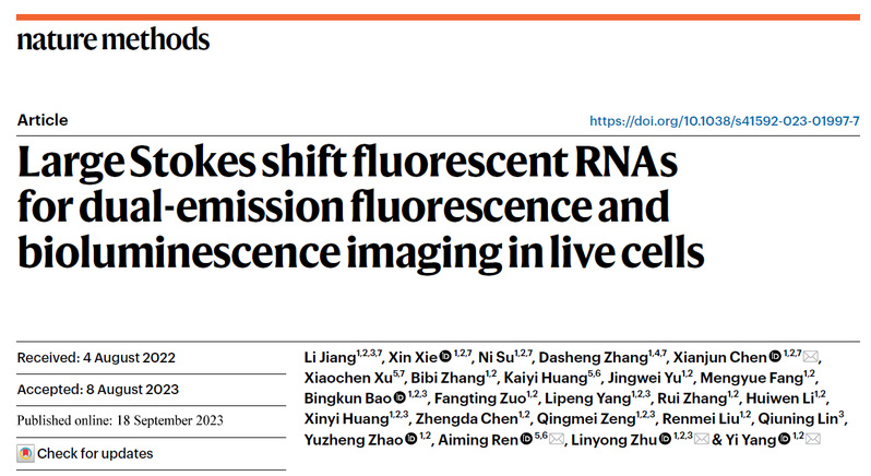 生物反应器工程国家重点实验室及校光遗传学与合成生物学交叉学科研究中心杨弋、朱麟勇、陈显军教授及浙江大学任艾明研究员组成的研究团队在活细胞RNA成像技术研究中取得突破性进展,在国际方法学权威学术期刊《自然—方法》(Nature Methods)以长篇论文(article)形式在线发表题为“Large stokes shift fluorescent RNAs for dual-emission fluorescence and bioluminescence imaging in live cells”的研究文章。