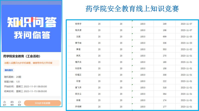 安全教育线上知识竞赛”活动。本次活动共计75人参与答题,其中100分有29人,95分有23人,90分有16人,85分有6人,80分1人。