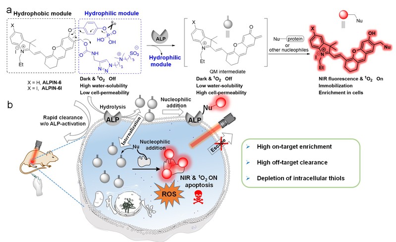 为了解决上述科学问题,研究团队在前期亚甲基苯醌自锚定探针设计基础上(Chem. Sci. 2020, 5889, Anal. Chem. 2020, 15017),进一步引入多重效果设计,使光敏剂能够在肿瘤组织高表达的碱性磷酸酶作用下同时实现亲水-亲酯转变、共价键锚定和光敏性能开启等三重变化,最终实现在肿瘤组织中的高度富集和光敏功能开启。实验表明,基于这一光敏剂的光动力治疗可实现对小鼠肿瘤组织的完全清除,同时所有测试小鼠恢复健康。该研究为解决激活型光敏剂和荧光探针分子在活体应用中的挑战提供了一种新思路。