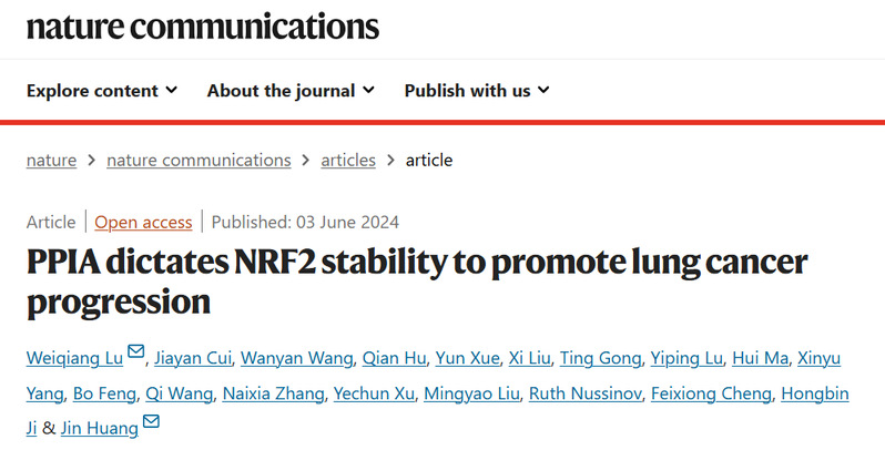 黄瑾课题组在国际权威学术期刊Nature Communications发表题为“PPIA dictates NRF2 stability to promote lung cancer progression”的研究论文,报道了PPIA是维持NRF2蛋白稳定性的关键伴侣蛋白,破坏PPIA/NRF2互作可导致NRF2蛋白水平下调,证明了PPIA/NRF2互作具有明确的可靶向性,是潜在的抗肺癌药物新靶标。