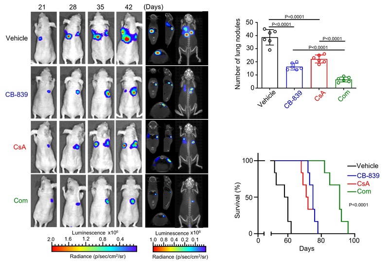 此外,本研究发现多肽类PPIA抑制剂CsA可以破坏PPIA/NRF2相互作用、增强NRF2泛素化-蛋白酶体降解,导致NRF2蛋白含量减少。通过克隆形成实验、肺癌原位瘤小鼠模型、PDX模型等实验发现:CsA与谷氨酰胺酶抑制剂CB839联用可以同时下调细胞内NRF2的蛋白含量与谷氨酰胺的代谢水平,表现出显著的协同抗癌效果。