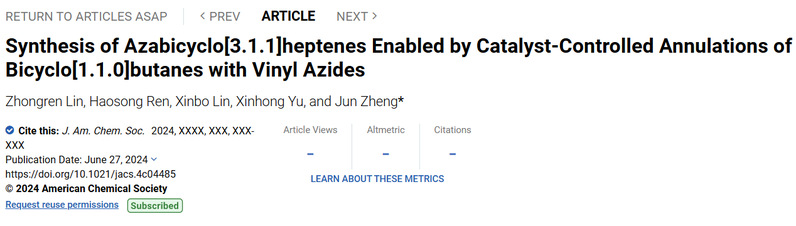 郑军课题组在国际权威学术期刊Journal of the American Chemical Society上发表题为“Synthesis of Azabicyclo[3.1.1]heptenes Enabled by Catalyst-Controlled Annulations of Bicyclo[1.1.0]butanes with Vinyl Azides”的研究论文,报道了课题组在催化剂调控双环[1.1.0]丁烷与α-烯基叠氮化物环化反应合成双环[3.1.1]庚烯的最新进展。