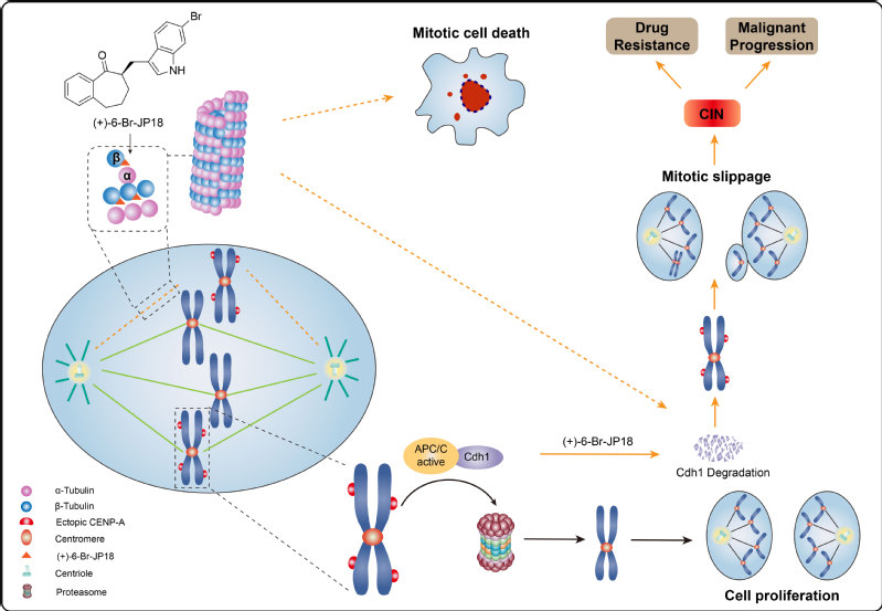 图1. (+)-6-Br-JP18破坏纺锤体微管组装和影响Cdh1介导的CENP-A溶酶体降解的作用机制示意图。该化合物通过靶向β-tubulin的秋水仙碱结合位点破坏微管组装,从而导致APC/C E3泛素连接酶共激活蛋白Cdh1的下调以及APC/C底物CENP-A的过度累积。这种累积会影响有丝分裂过程中染色体的精确分离,并可能引起染色体不稳定性的出现。