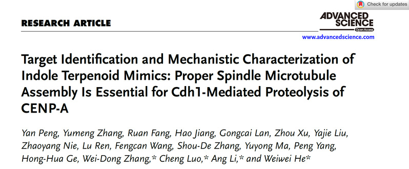 何薇薇课题组与中国科学院上海有机化学研究所李昂课题组、中国科学院上海药物研究所罗成课题组、海军军医大学张卫东课题组合作,利用吲哚萜模拟物作为工具,在有丝分裂保真性调控机制研究中取得新进展,相关成果以“Target Identification and Mechanistic Characterization of Indole Terpenoid Mimics: Proper Spindle Microtubule Assembly Is Essential for Cdh1-Mediated Proteolysis of CENP-A”为题发表于Advanced Science期刊。