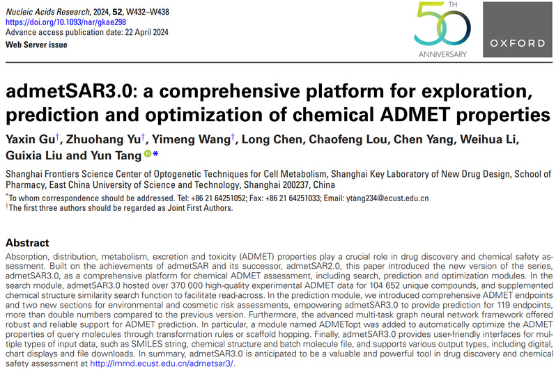 唐赟教授课题组发布了全面升级的化合物ADMET性质综合评估平台admetSAR3.0,该平台能够为化合物ADMET数据搜索、性质预测和优化提供一站式服务,用户可通过如下链接免费使用该平台://lmmd.tranimes.com/admetsar3/。相关研究成果以“admetSAR3.0: a comprehensive platform for exploration, prediction and optimization of chemical ADMET properties”为题,发表于国际著名期刊《核酸研究》(Nucleic Acids Research,IF=16.6)。