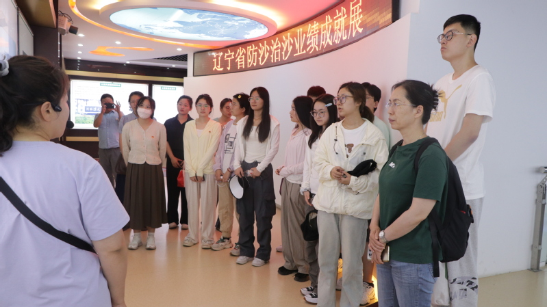 上午,在徐晓勇老师和杨武林老师的带领下,学生们乘坐大巴车抵达了辽宁省阜新市彰武县的新时代文明实践基地——弘扬传承治沙精神基地。在讲解员的引领下,师生们首先参观了治沙历程展览馆,通过生动的图片、详实的文字和珍贵的历史影像资料,师生们穿越时空般地见证了彰武人民从荒漠化严重的昔日到如今绿意盎然的万亩松树林的科学治沙历程。
