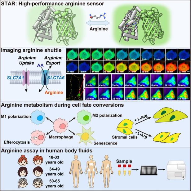 、生物反应器工程国家重点实验室、上海市细胞代谢光遗传学技术前沿科学研究基地赵玉政教授、杨弋教授以及上海交通大学医学院附属第九人民医院方伟副主任医师合作在Cell子刊Cell Metabolism发表题为“Lighting up arginine metabolism reveals its functional diversity in physiology and pathology”的技术长文。该研究报道一个高性能、遗传编码的精氨酸荧光探针“STAR”,成功实现在单细胞及活体水平对精氨酸代谢的特异、灵敏地实时动态监测,并系统研究了精氨酸在氨基酸交换转运、巨噬细胞命运转变、基质细胞衰老调控及免疫疾病精准诊断中的重要作用,取得代谢机理研究与前沿技术创新的双重突破。