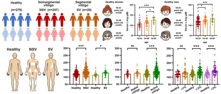 此外,STAR探针在临床应用方面也展现了巨大的潜力。研究团队利用该探针开发了一种简便快速的精氨酸检测方法,能够即时检测人体血清中的精氨酸水平。有趣地发现在健康成年女性和男性群体中,血清精氨酸水平随着年龄的增长而逐渐增加。此外,白癜风患者样本分析数据表明血清精氨酸水平与白癜风的疾病活动性和严重程度密切相关。相较于稳定期,进展期的白癜风患者血清中精氨酸水平显著升高,而这一生物标志物有望用于白癜风的早期诊断和疾病进展监测。