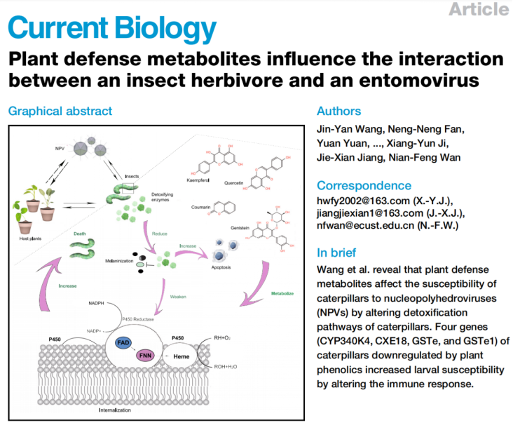 万年峰研究员课题组,联合我国、英国、美国科研人员,阐明了植物多样性介导下植物次生代谢物通过调节昆虫解毒代谢影响病毒杀虫剂杀虫效果的机制,在国际生物学著名期刊Cell子刊—Current Biology上以Articles形式发表了题为“Plant defense metabolites influence the interaction between an insect herbivore and an entomovirus”长篇研究论文。