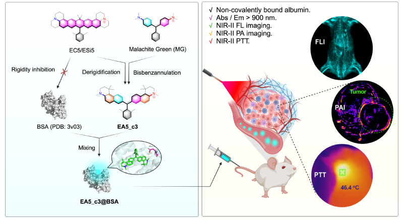 钱旭红院士、杨有军教授团队设计并两步合成具有“螺旋桨构型”的深近红外三芳基甲烷衍生物(EA5系列染料)。利用生物内源性白蛋白对EA5染料进行包封极大地提高了染料的荧光亮度,并解决了大多数近红外染料面临的合成步骤冗长、生物兼容性差、热力学稳定性差和水溶性差的难题。相关成果以“Albumin-ChaperonedDeep-NIR Triarylmethane Dyes for High-Contrast In Vivo Imaging and Photothermal Therapy”为题发表在Advanced Materials(Adv. Mater.2024, 2411515)上。