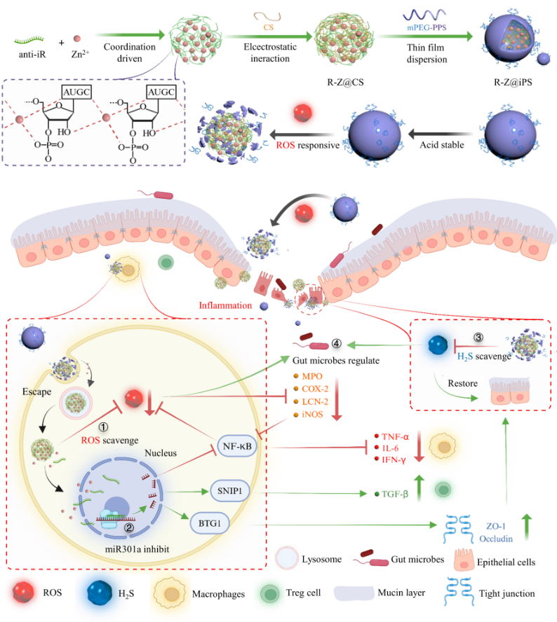 高峰教授课题组又有新突破,首次提出一种能有效调控炎症结肠部位ROS和H2S等自由基水平的反义寡核苷酸和锌配位的纳米酶。同时,本研究在前期金属基配位靶向纳米递药平台设计策略,配位机制和构建研究的基础上(Asian J. Pharm. Sci.,2024,19,100858;Adv. Healthc. Mater.,2024,2024,2401869;ACS Appl. Mater. Interfaces,2025,17,617),首次将上述锌基配位纳米酶,联合壳聚糖和PEG修饰的聚丙烯硫醚[PEG-poly(propylenesulfide),PEG-PPS]组成的ROS响应杂合脂质纳米递药平台,用于同时实现anti-miR-301a的口服递送,自由基-炎症通路调节,肠道屏障和菌群恢复等多重功能,从而实现IBD的有效治疗。相关研究对反义寡核苷酸的口服递送以及IBD的微环境调控均具有重要价值。相关成果以“An anti-miR-301a and zinc coordination driven nanozyme loaded in nanoparticle for oral therapy of inflammatory bowel disease based on colitis microenvironment regulation”为题发表在国际权威学术期刊Chemical Engineering Journal上。同人动漫