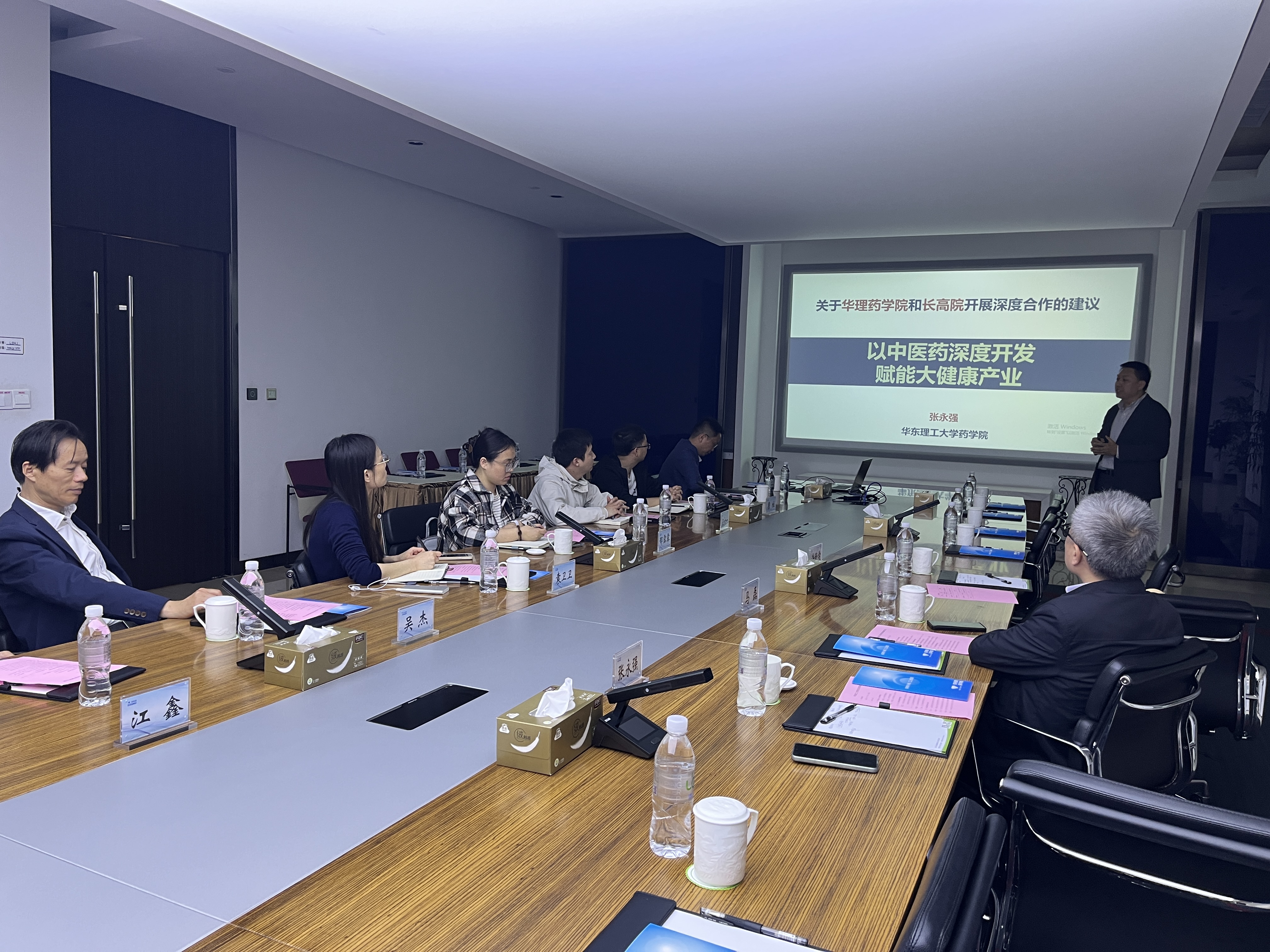 在药物设计、药物化学、药理学、药物分析等方面有着很好的科研背景,并且近年学院在中医药深度开发领域有着许多突出成果,能够为企业在相关领域的研发工作提供良好的技术和人才支持。随后,双方就后续校地合作模式、资源共享机制及未来发展方向进行了深入探讨。江苏崇恒医疗科技有限公司总经理汪六一、泉养堂(江苏)生物医药有限公司总监陈晓丹、江苏巴帝恩生物科技有限公司研究所副所长詹柱、江苏冬泽特医食品有限公司质量负责人李志峰、江苏神猴医药研究有限公司质量负责人席慧珍等参与本次交流。