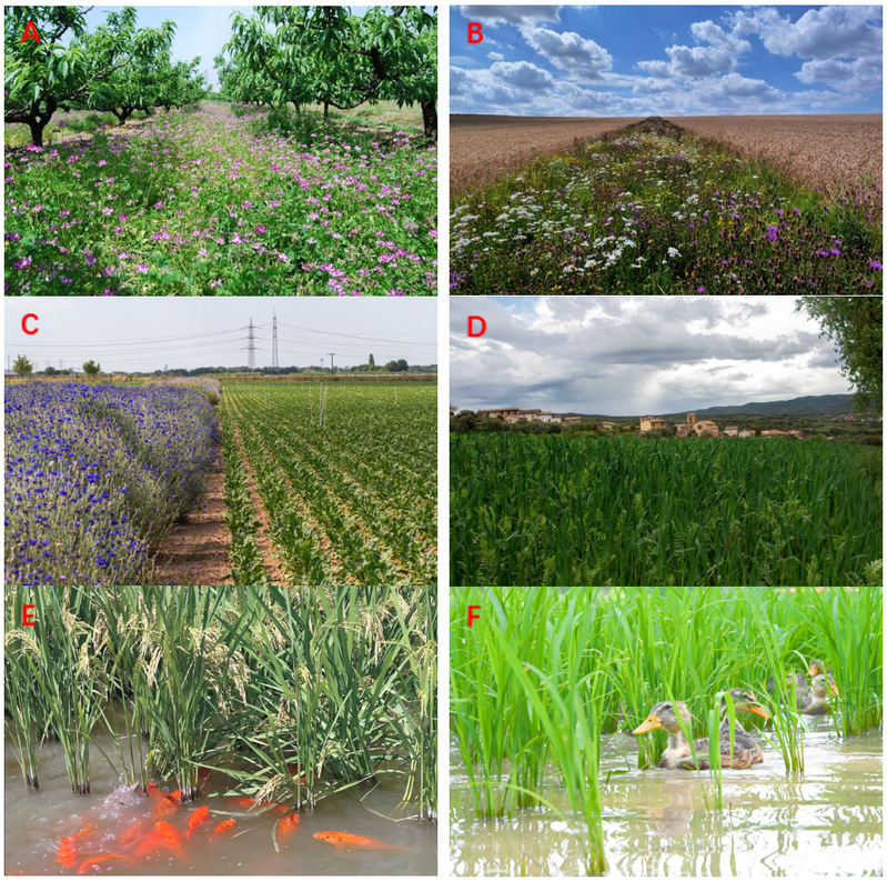 E:稻田养鱼,中国浙江青田;F:稻田养鸭,中国江苏南京)