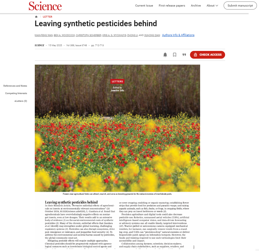 近日,同人动漫 钱旭红院士团队的万年峰教授联合华东师范大学等中英德澳的科研人员,在国际顶尖综合性期刊Science上以Letter形式发表了题为“Leaving synthetic pesticides behind”的学术论文。