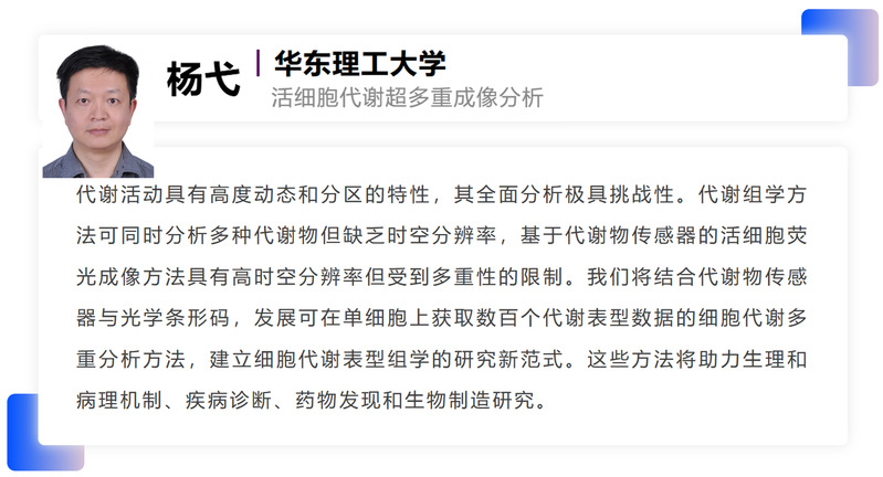 杨弋,教授,博士生导师,基金委创新群体负责人,科技部重点研发计划首席科学家,国家杰出青年科学基金获得者,入选多个国家、教育部及上海市人才计划与荣誉称号,现任中国生物化学与分子生物学会理事,中国生物化学与分子生物学会酶学专业委员会主任委员,中国生物物理学会理事,上海市生物化学与分子生物学学会副理事长。他长期从事光遗传学与合成生物学研究,近年来在活细胞代谢及基因表达的精密监测与控制技术研究上取得了国际领先的系列创新成果,所发展的光控基因表达系统、细胞代谢荧光探针及高性能荧光RNA等原创技术为生命科学研究提供了有力工具。相关成果发表于Nature Biotechnology、Nature Methods、Nature Chemical Biology、Cell Metabolism等一流期刊。这些前沿技术获得了国际同行的广泛关注,被评价为“颠覆性”、为相关研究“铺平道路”,已被哈佛大学、麻省理工等国际一流研究机构的千余个研究组跟踪应用,典型应用成果发表于Science、Nature等期刊。